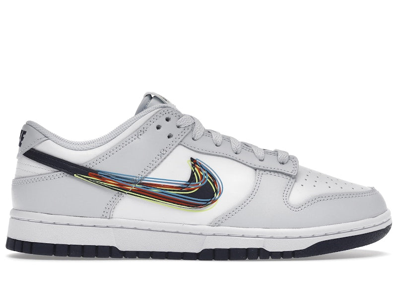 Het bovenwerk bestaat uit een mix van premium leer in wit, grijs en zwart, terwijl de 3D Swooshes in blauw en rood voor die futuristische touch zorgen. De rubberen zool biedt vertrouwde grip, maar het zijn de visuele details die deze Dunk Low echt onderscheiden van de rest. Een must-have voor wie zijn sneakercollectie meer diepte – letterlijk – wil geven.